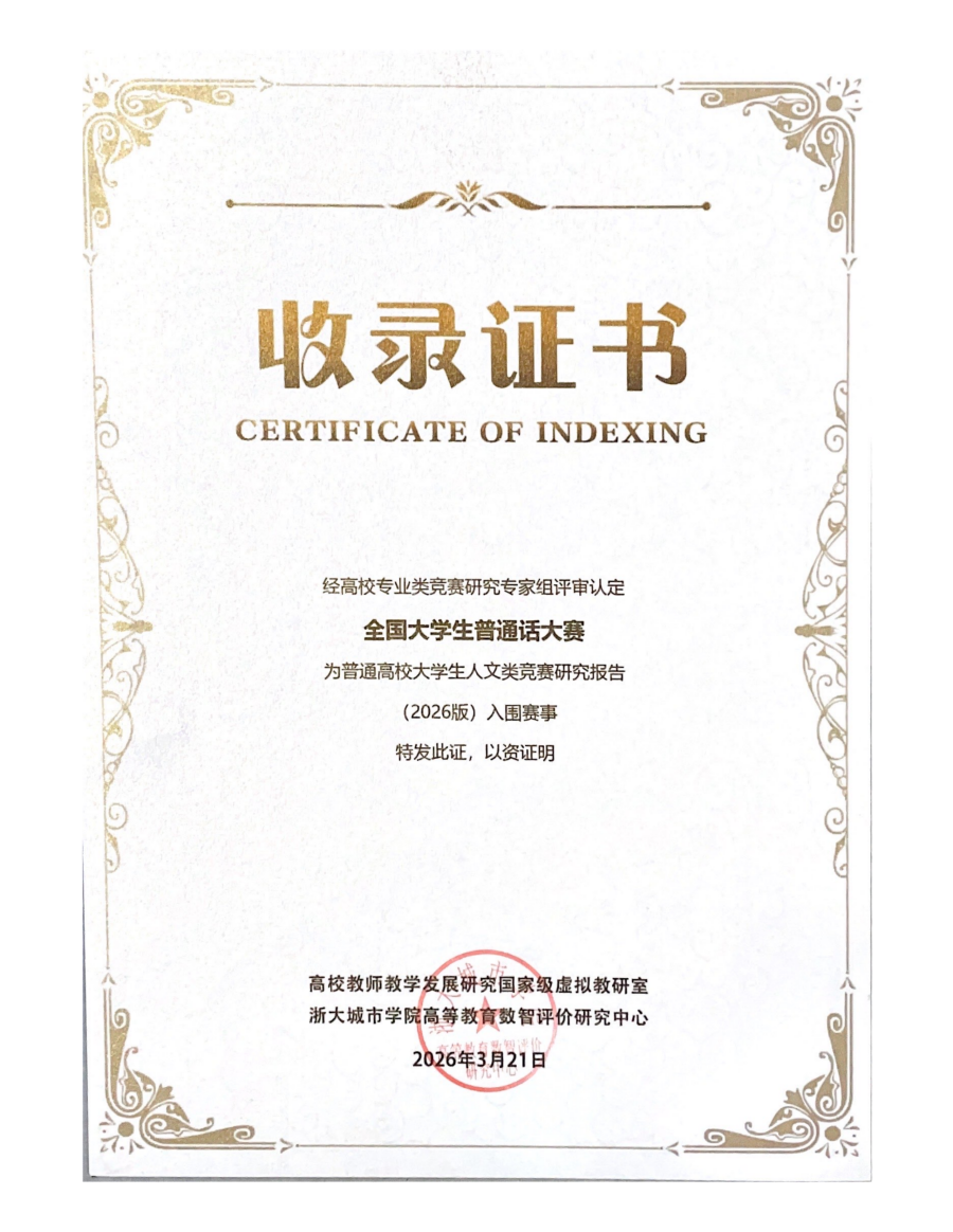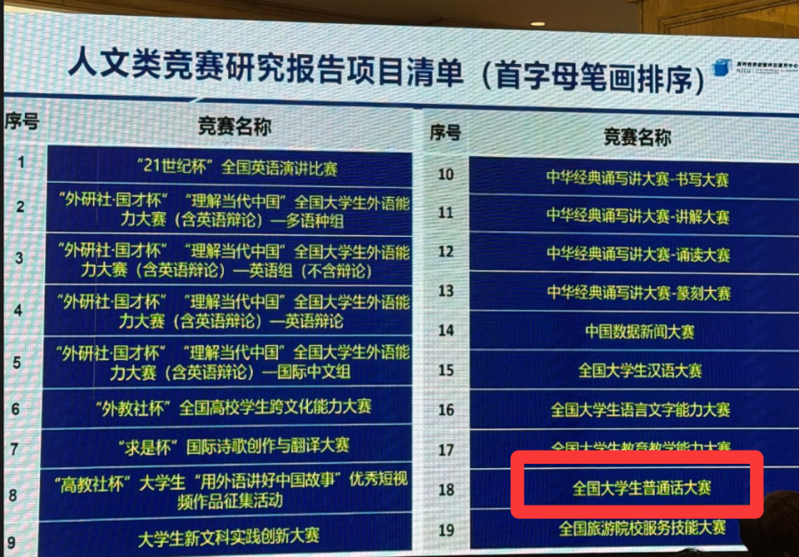 喜报!大学生普通话大赛成功入选“普通高校大学生人文类竞赛指数研究(2026版)” ▲会议主会场现场 3月21日,2026第五届高校大学生竞赛与创新人才培养会议在浙江横店隆重举行。本次研讨会汇聚全国高校专家学者、赛事主办方、新闻媒体工作者等600余人,聚焦竞赛高质量发展、标准化建设与创新人才培养核心议题,共商高校竞赛育人新格局。全国大学生普通话大赛组委会受邀参会,且赛事成功入选“普通高校大学生人文类竞赛指数研究(2026版)”,彰显了大赛在推广国家语言、增强文化认同、铸牢中华民族共同体意识上的重要价值。 ▲大赛亮相国内权威学科竞赛赛事墙 本届高校大学生竞赛与创新人才培养研讨会,由高校教师教学发展研究国家级虚拟教研室、浙大城市学院高等教育数智评价研究中心、浙江师范大学、杭州电子科技大学、中国计量大学等单位联合主办,横店镇人民政府承办。会上,国家级教学名师、浙江大学求是特聘教授何钦铭作《高校大学生竞赛指数研究报告》,并发布了人文类、计算机类、机器人类、艺术与设计大类等十大专业类竞赛指数和竞赛画像,全国大学生普通话大赛凭借规范的赛事运营、显著的育人成效与广泛的社会影响力,成功入选人文类竞赛研究报告项目清单,与中华经典诵写讲大赛等高水平人文类赛事并肩,正在成为推动高校人文素质教育的重要力量。 ▲入围赛事证书颁授仪式 全国大学生普通话大赛以推广普通话为契机,进一步提高大学生的语言文字规范意识,以赛促学,希冀推动高校普通话教育的深化和中华优秀语言文化的传承弘扬。大赛采用无纸化机考模式,由讯飞语音评测系统提供技术支持,按组别评奖。大赛已被全国多所高校纳入校内竞赛名单,认定为Ⅱ甲类、国家级二类等不同级别的竞赛,获奖证书可作为学生评奖评优的重要支撑材料。 ▲2026版榜单赛事入选证书 ▲入选人文类竞赛研究报告项目清单 据悉,“普通高校大学生人文类竞赛指数研究(2026版)”由高校教师教学发展研究国家级虚拟教研室、浙大城市学院高等教育数智评价研究中心联合研制,旨在构建科学的人文类竞赛评价体系,规范赛事生态,为高校人文素质教育提供参考依据,助力实现“以赛促教、以赛育人”的办学理念。此次入选后,大赛将以此为契机,进一步优化赛制设计,强化与高校语言文字课程体系的衔接,持续深化语言文化传播与人文素养培育,为推动国家通用语言文字高质量普及、弘扬中华优秀传统文化贡献赛事力量。 请仔细看正文,正文里有报名办法,或者报名官网。