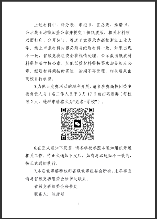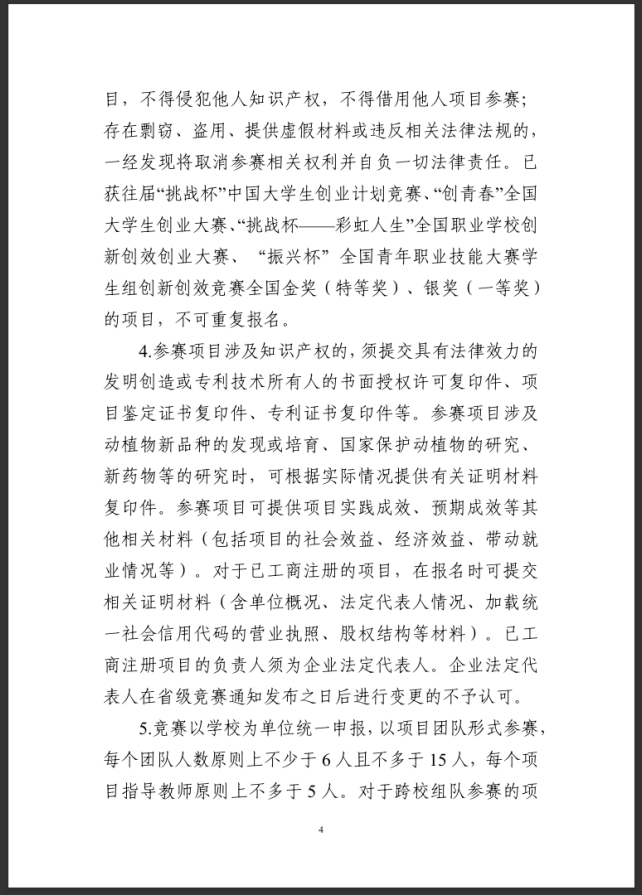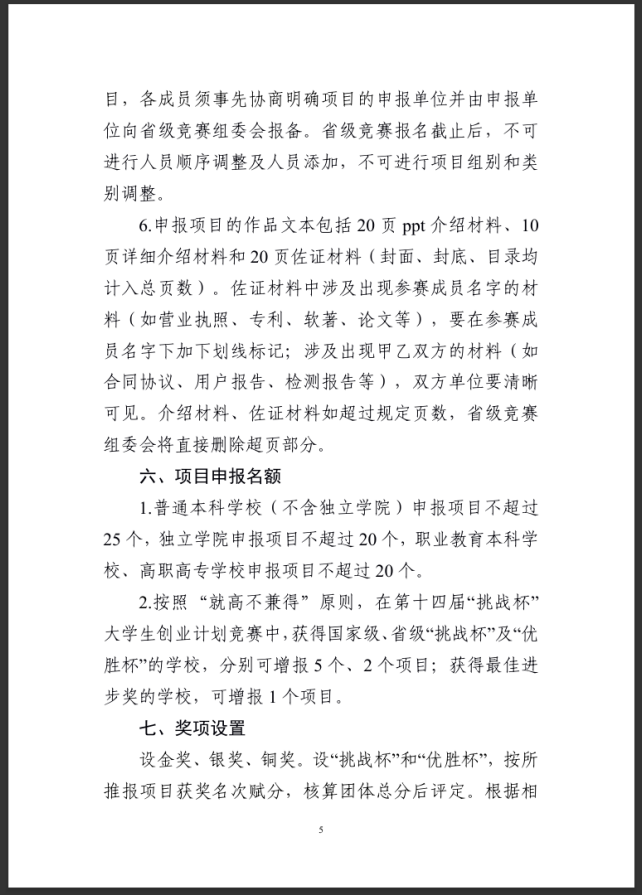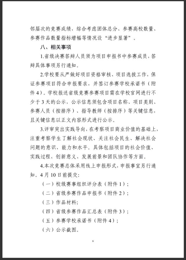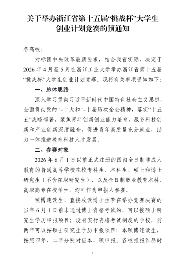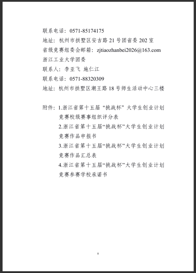 附件: 附件1 浙江省第十五届“挑战杯”大学生创业计划竞赛校级赛事组织评分表 ._附件2 浙江省第十五届“挑战杯”大学生创业计划竞赛作品申报书.docx 附件3 浙江省第十五届“挑战杯”大学生创业计划竞赛作品汇总表._附件4 浙江省第十五届“挑战杯”大学生创业计划竞赛参赛学校承诺书.docx 本文信息搜集整理自互联网,信息版权及活动解释权归主办单位所有,我爱竞赛网仅作媒体支持。 报名联系方式: 经过学校校赛选拔后,统一报送作品参加省级比赛。