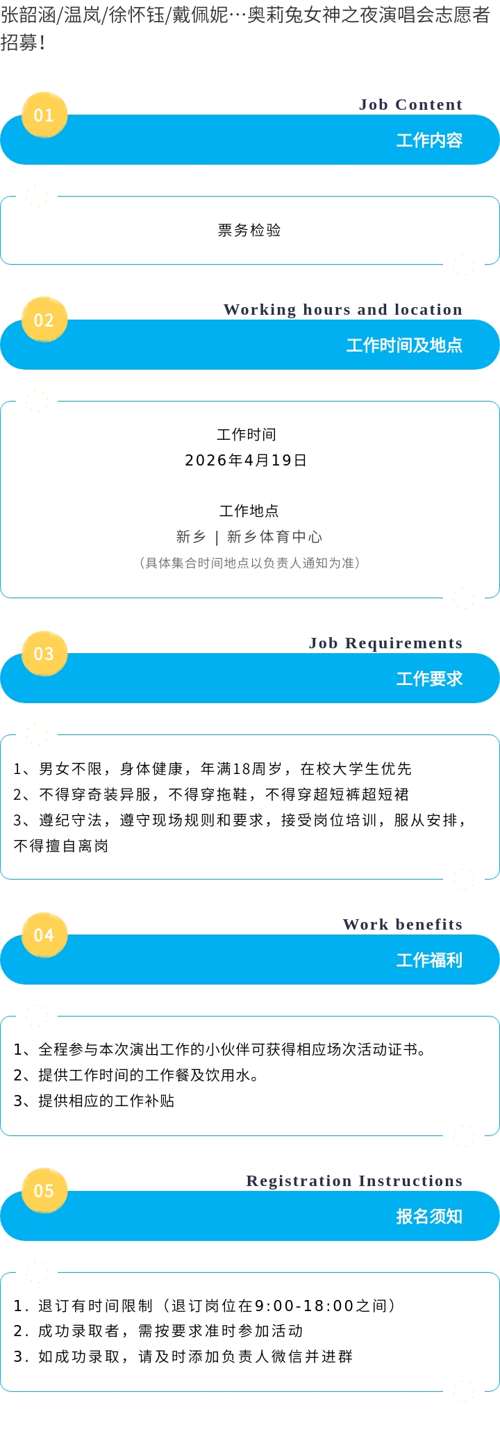 奥莉兔女神之夜演唱会志愿者招募 扫码关注公众号“大学生志愿者信息” 后台回复“637”进行报名 本文信息搜集整理自互联网,信息版权及活动解释权归主办单位所有,我爱竞赛网仅作媒体支持。 请仔细看正文,正文里有报名办法,或者报名官网。