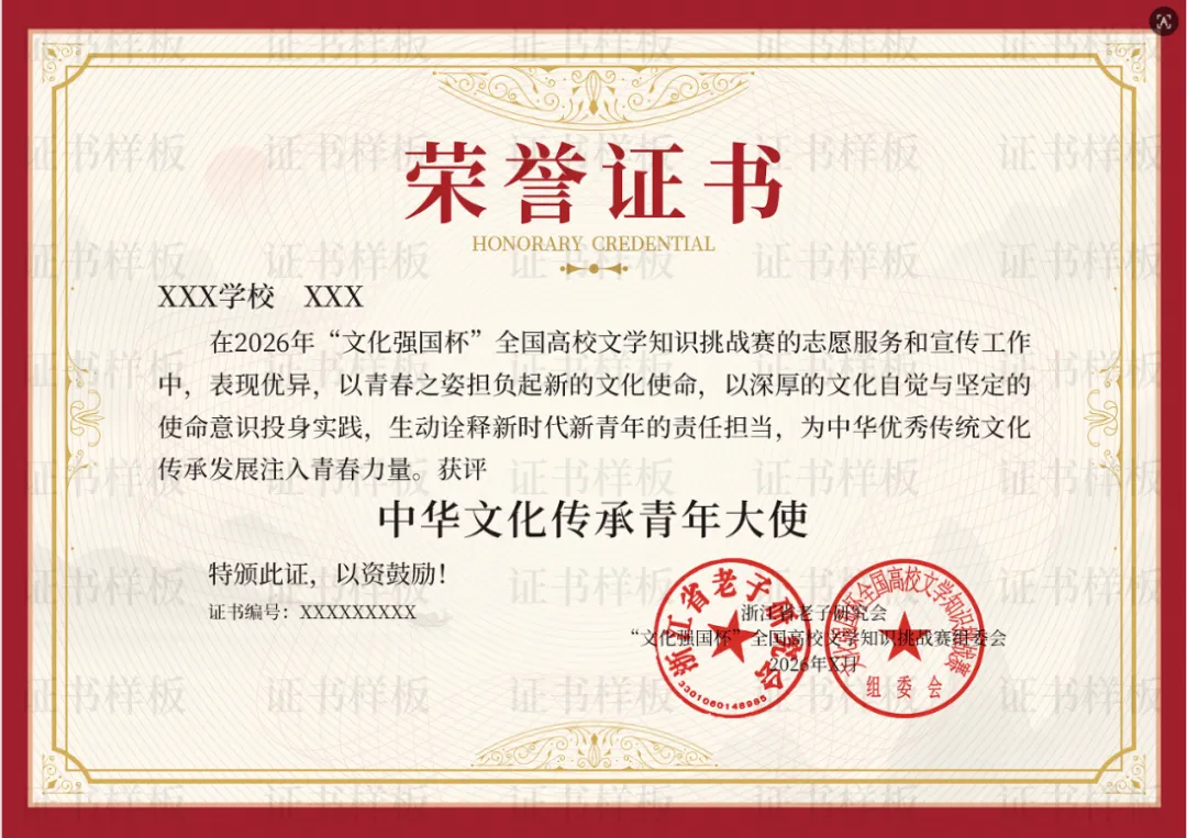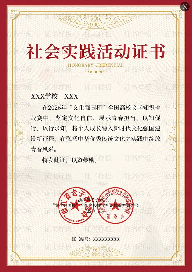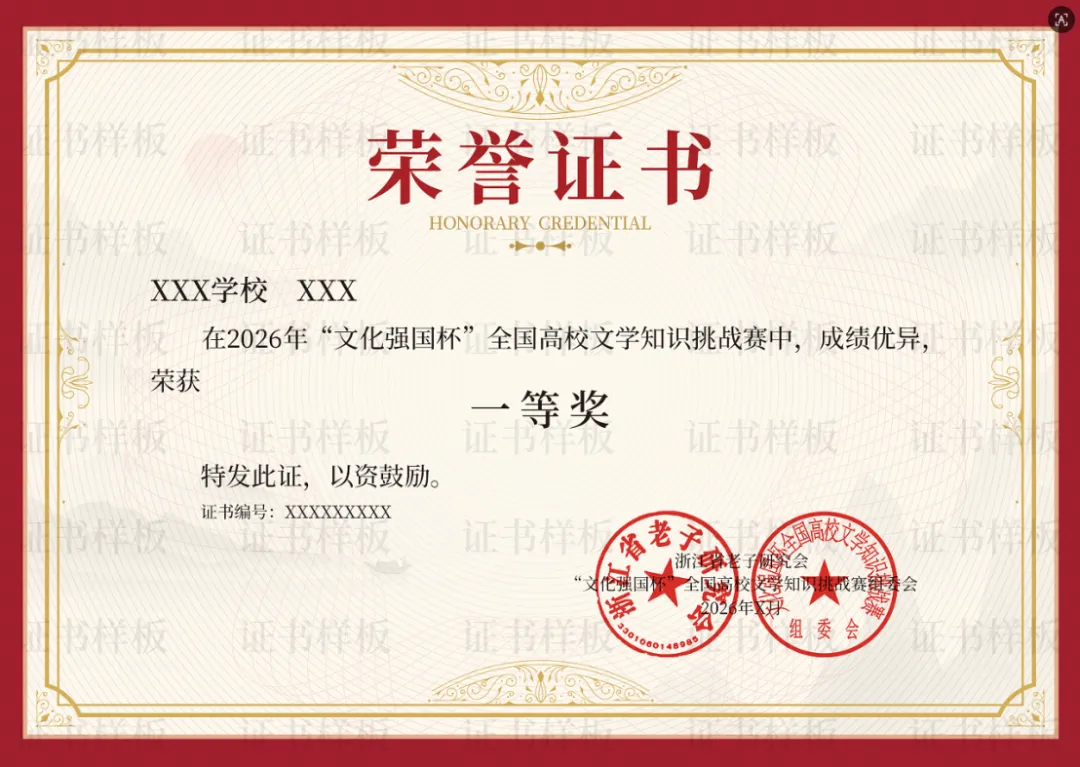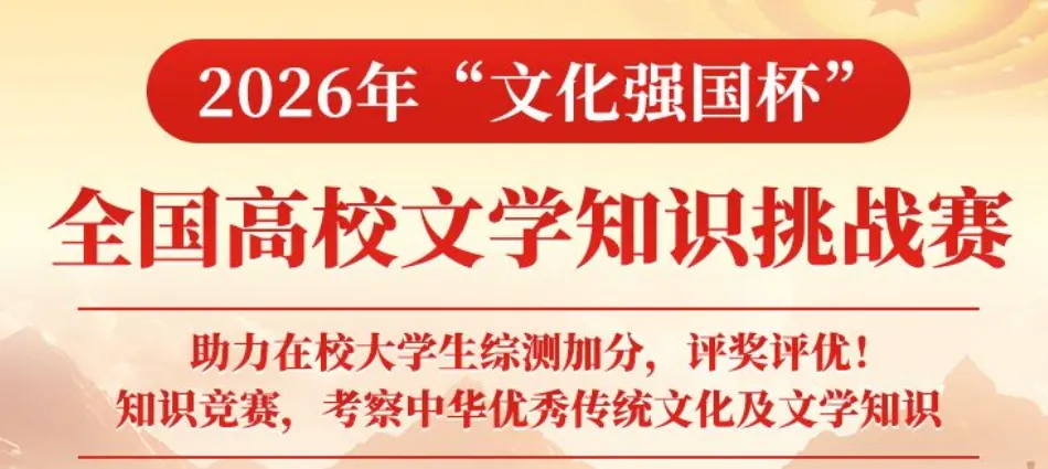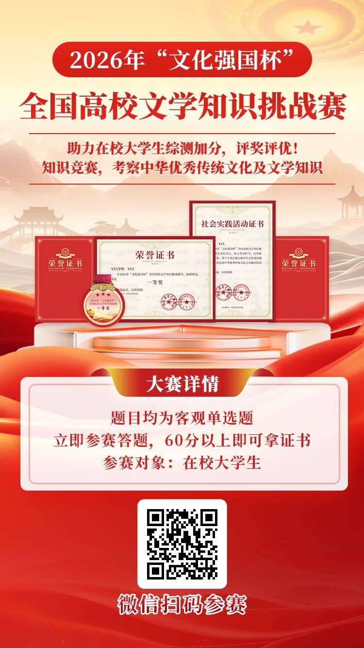 2026年“文化强国杯”全国高校文学知识挑战赛 报名时间:即日起至2026年10月16日 免费参赛,60分即可领取证书 大赛背景 各有关单位、高等院校师生: 为深入贯彻落实党的二十届四中全会精神,助力激发全民族文化创新创造活力,繁荣发展社会主义文化,引领高等院校学生更好担负起新的文化使命,在植根博大精深的中华文明之基础上,团结各界力量以扎实推进文化强国建设,提升中华文明传播力影响力,推动老子相关学术交流,浙江省老子研究会现决定面向全国高等院校学生开展2026年“文化强国杯”全国高校文学知识挑战赛。现将大赛相关事宜通知如下,细则详见附件。 期待各高校做好报名、组织工作。建议各高校将本次大赛获奖成绩作为大学生综合素质测评及相关加分评优的重要参考依据。 一、组织机构 组织单位:“文化强国杯”全国高校文学知识挑战赛组委会 主办单位:浙江省老子研究会 承办单位:我爱竞赛网 二、参赛对象 全国高校在校生(含研究生、本科生、专科生,专业不限) 三、大赛形式 (一)报名时间: 即日起至2026年10月16日 (二)比赛时间: 即日起至2026年10月16日 (三)比赛形式: 在比赛时间内的任意时间段登录大赛官方报名网站:http://wenxue.52jingsai.com/报名后进行在线考试。考试限时30分钟。题目均为客观单选题,系统自动评分。以中华优秀传统文化知识及文学知识为主要内容。 四、设置奖项 (一)个人奖项 一等奖:考试分数 90 分及以上 二等奖:考试分数 80 分至 89 分 三等奖:考试分数 70 分至 79 分 优秀奖:考试分数 60 分至 69 分 以上奖项均颁发电子版获奖证书。可自愿申领纸质实体证书。 (二)优秀指导教师奖 本挑战赛设“优秀指导教师奖”。组织报名且成功完成比赛的学生人数达到30人及以上的教师,将被授予“优秀指导教师奖”,颁发纸质版证书。 (三)优秀组织单位奖 高等院校及其下属机构、学生组织、相关教育及文化机构等均可在报名页面自行申请或联系组委会负责人填写申请成为大赛协办单位。报名且成功完成比赛的人数达到100人及以上的单位,将被授予“优秀组织单位奖”纸质版证书。 证书模板 01获奖证书 02社会实践活动证书 03志愿者证书 04最佳志愿者证书 05中华文化传承青年大使 06优秀指导教师 07优秀组织单位 08荣誉奖章 五、大赛收费 大赛组委会秉承公益原则,不收取报名费用并免费提供电子版参赛获奖证书。参赛选手可自愿付费申领邮寄纸质版证书。 六、志愿者招募 根据不同志愿服务内容,发放 “优秀志愿者”“最佳志愿者”“中华文化传承青年大使”等荣誉证书。 七、其他事项 本挑战赛规则、章程的最终解释权归浙江省老子研究会秘书处、“文化强国杯”全国高校文学知识挑战赛组委会所有。大赛组委会负责本挑战赛组织、实施等各项工作。 八、联系方式 参赛问题咨询:公众号青年行动社 大赛组委会竞赛系统联系人:梁老师 联系电话:19942406410 长按扫码立即参赛 请仔细看正文,正文里有报名办法,或者报名官网。