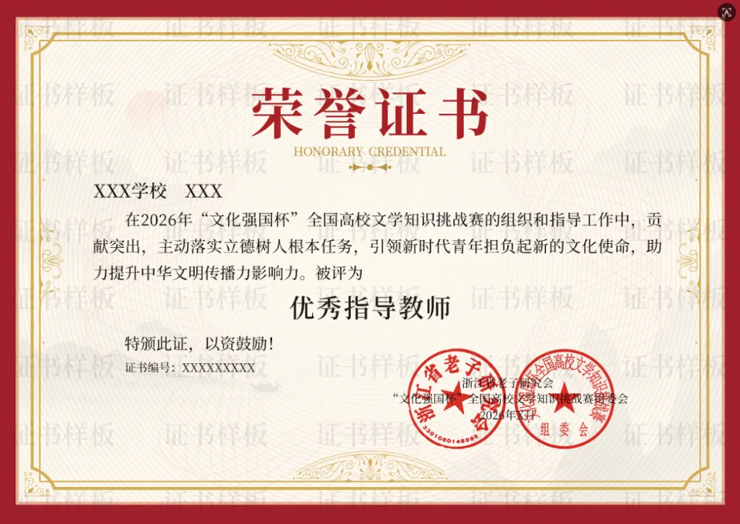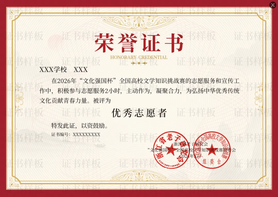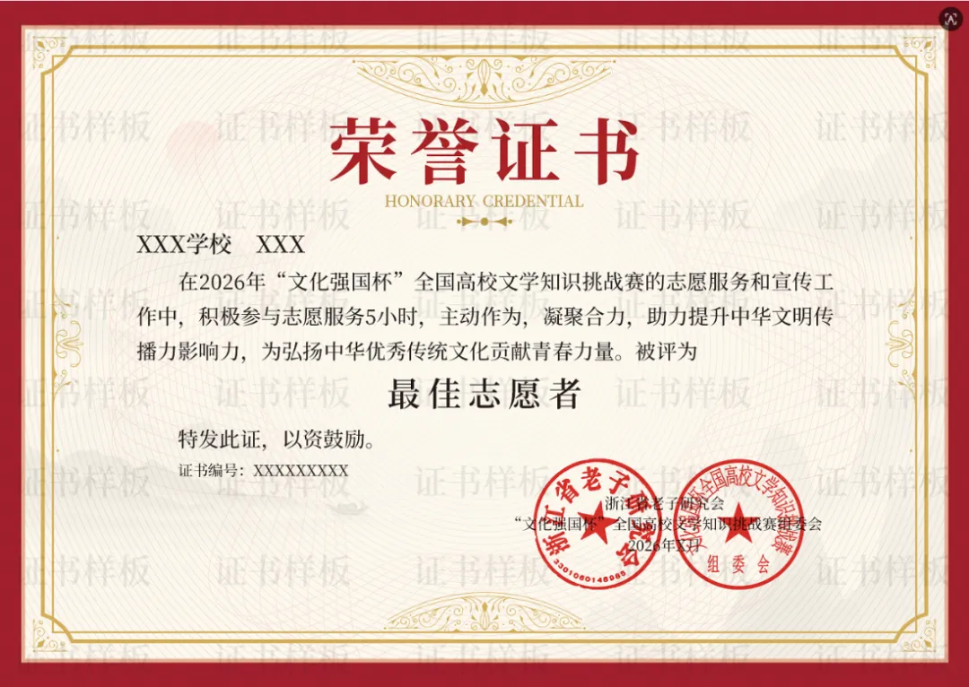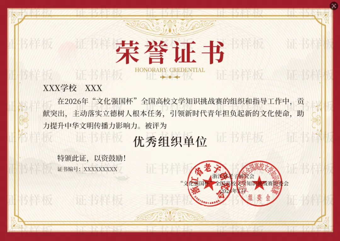 2026年“文化强国杯”全国高校文学知识挑战赛 报名时间:即日起至2026年10月16日 免费参赛,60分即可领取证书 大赛背景 各有关单位、高等院校师生: 为深入贯彻落实党的二十届四中全会精神,助力激发全民族文化创新创造活力,繁荣发展社会主义文化,引领高等院校学生更好担负起新的文化使命,在植根博大精深的中华文明之基础上,团结各界力量以扎实推进文化强国建设,提升中华文明传播力影响力,推动老子相关学术交流,浙江省老子研究会现决定面向全国高等院校学生开展2026年“文化强国杯”全国高校文学知识挑战赛。现将大赛相关事宜通知如下,细则详见附件。 期待各高校做好报名、组织工作。建议各高校将本次大赛获奖成绩作为大学生综合素质测评及相关加分评优的重要参考依据。 一、组织机构 组织单位:“文化强国杯”全国高校文学知识挑战赛组委会 主办单位:浙江省老子研究会 承办单位:我爱竞赛网 二、参赛对象 全国高校在校生(含研究生、本科生、专科生,专业不限) 三、大赛形式 (一)报名时间: 即日起至2026年10月16日 (二)比赛时间: 即日起至2026年10月16日 (三)比赛形式: 在比赛时间内的任意时间段登录大赛官方报名网站:http://wenxue.52jingsai.com/报名后进行在线考试。考试限时30分钟。题目均为客观单选题,系统自动评分。以中华优秀传统文化知识及文学知识为主要内容。 四、设置奖项 (一)个人奖项 一等奖:考试分数 90 分及以上 二等奖:考试分数 80 分至 89 分 三等奖:考试分数 70 分至 79 分 优秀奖:考试分数 60 分至 69 分 以上奖项均颁发电子版获奖证书。可自愿申领纸质实体证书。 (二)优秀指导教师奖 本挑战赛设“优秀指导教师奖”。组织报名且成功完成比赛的学生人数达到30人及以上的教师,将被授予“优秀指导教师奖”,颁发纸质版证书。 (三)优秀组织单位奖 高等院校及其下属机构、学生组织、相关教育及文化机构等均可在报名页面自行申请或联系组委会负责人填写申请成为大赛协办单位。报名且成功完成比赛的人数达到100人及以上的单位,将被授予“优秀组织单位奖”纸质版证书。 证书模板 01获奖证书 02社会实践活动证书 03志愿者证书 04最佳志愿者证书 05中华文化传承青年大使 06优秀指导教师 07优秀组织单位 08荣誉奖章 五、大赛收费 大赛组委会秉承公益原则,不收取报名费用并免费提供电子版参赛获奖证书。参赛选手可自愿付费申领邮寄纸质版证书。 六、志愿者招募 根据不同志愿服务内容,发放 “优秀志愿者”“最佳志愿者”“中华文化传承青年大使”等荣誉证书。 七、其他事项 本挑战赛规则、章程的最终解释权归浙江省老子研究会秘书处、“文化强国杯”全国高校文学知识挑战赛组委会所有。大赛组委会负责本挑战赛组织、实施等各项工作。 八、联系方式 参赛问题咨询:公众号青年行动社 大赛组委会竞赛系统联系人:梁老师 联系电话:19942406410 长按扫码立即参赛 请仔细看正文,正文里有报名办法,或者报名官网。