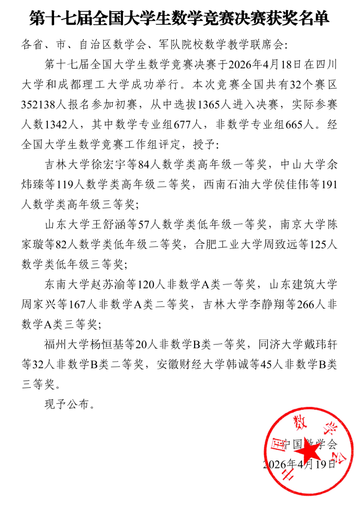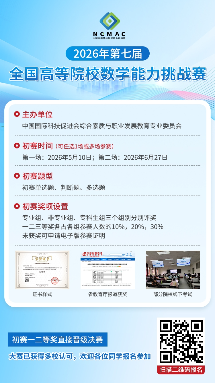 第十七届全国大学生数学竞赛决赛获奖名单公布 大赛官网:www.ncmac.cn 扫描下方二维码关注“大学生数学竞赛” 后台回复【数学竞赛】获取PDF版获奖名单 获奖名单 赛事推荐: 2026年第七届全国高等院校数学能力挑战赛 部分表彰报道 大赛官网:www.ncmac.cn 大赛交流QQ群:864933103 报名方式 (扫描上方二维码报名) 扫描下方二维码 关注“大学生数学竞赛”,查看更多数学类赛事及资讯 请仔细看正文,正文里有报名办法,或者报名官网。