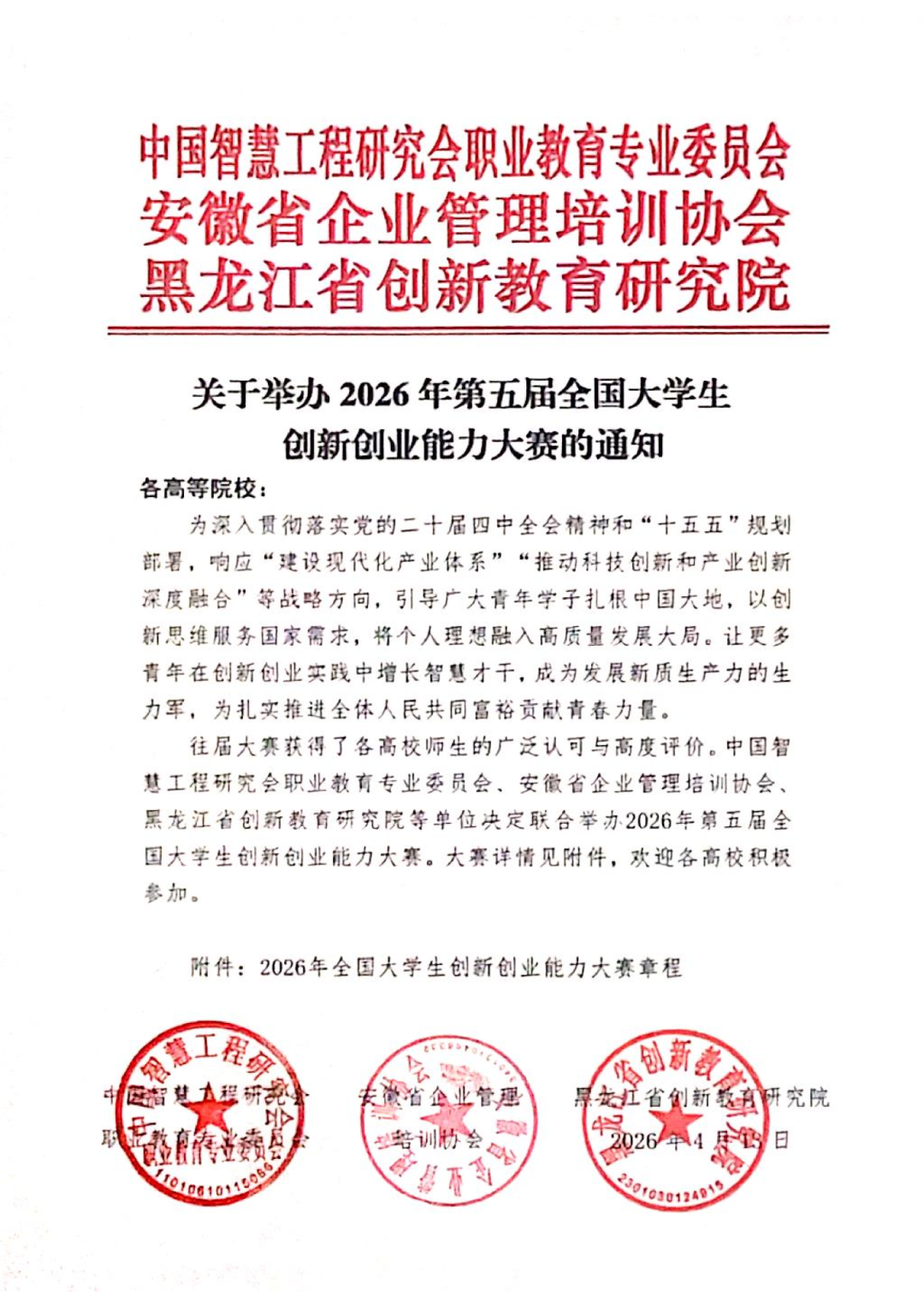 为深入贯彻落实党的二十届四中全会精神和“十五五”规划部署,响应“建设现代化产业体系”“推动科技创新和产业创新深度融合”等战略方向,引导广大青年学子扎根中国大地,以创新思维服务国家需求,将个人理想融入高质量发展大局。让更多青年在创新创业实践中增长智慧才干,成为发展新质生产力的生力军,为扎实推进全体人民共同富裕贡献青春力量。往届大赛获得了各高校师生的广泛认可与高度评价。中国智慧工程研究会职业教育专业委员会、安徽省企业管理培训协会、黑龙江省创新教育研究院等单位决定联合举办2026年第五届全国大学生创新创业能力大赛。