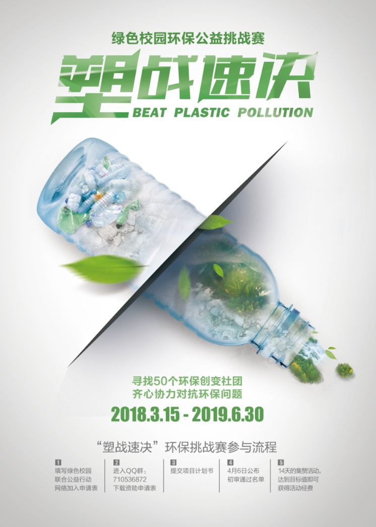 “塑战速决”高校环保挑战赛丨8000元环保资助等你来绿色能量正在加载中... 每一秒,这个世界都在发生着微妙的变化,稀有植物的数量正在减少、很多动物濒临灭绝、海平面在慢慢上升…我们每一秒呼吸到的空气,吮吸的每一滴水,都在这一秒内发生了上万种变化,才抵达我们的身体内部,满足我们的需求。 虽然我们可能没有感受到这种变化,但我们一直置身其中。 环保的口号已经喊了很久了,这个世界因为环保人士点滴汇聚的力量,悄然发生改变。 我们还在挣扎,我们还在抵抗,只是因为我们只有这一个生存家园。 图/kianey羊 1972年,联合国《人类环境宣言》就提出,“各界人士和多领域中的社团组织,通过其自身的价值和采取的行动,将会塑造未来世界环境的格局”。 2015年,联合国确立了17项可持续发展目标,其中有8项与环保有着密切的联系。 跨越了半个世纪,人们对环保的重视程度依然不减。可见环保的重要性已经得到了世人的重视。 2018首个大活动 “塑战速决”绿色校园环保公益挑战赛 活动介绍 “塑战速决”活动由中国石油与中国扶贫基金会联合发起的“益路同行”公益平台支持,计划从4月开始,开始三期的公益环保资助专题活动,寻找50个环保创变者,提供资金及辅导,帮助更多的年轻人去实践环保梦,齐心协力对抗环保问题。(环保领域不限) 时间安排 申报时间:2018年3月15日-2018年4月6日 执行时间:2018年6月-2019年6月 ➡填写绿色校园联合公益行动网络加入申请表(http://lxi.me/ebf3t),加入我们成为“绿芽”才有资格参与“塑战速决”环保挑战赛等系列环保活动。 ➡ 进入QQ群:710536872 ,群里下载报名表 提交项目计划书,包含具体实施细节和项目预算 ➡4月6日公布初审名单 4月9日在“益路同行”官网提交,完成审核 4月12日前将初审修改后的项目上线益路同行APP http://handinhand.cnpc.com.cn(届时会有群培训) 越早提交,被选上的可能性越高! 环保项目具有创新性,用新的方法去解决当下的环保问题 项目具有较强的落地性,我们不想看到纸上谈兵 项目具有较强的传播性,传播方式丰富,影响广泛 可申请项目预算:固定8000元 成为绿色校园联合公益行动网络一员 优先参与先锋讲坛、高校论坛、回箱计划等活动 Z强实力奖:10个直通7月广州全国大学生绿色论坛活动 通过的项目可获得固定8000的公益资助